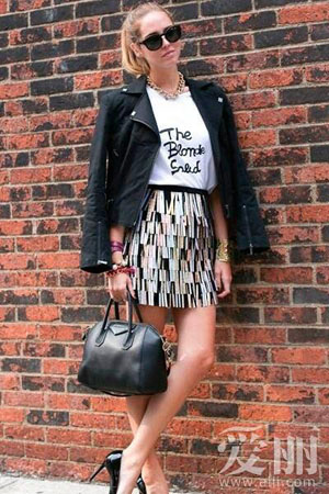 1. 白色字母T恤搭配印花图案短裙,外搭黑色皮革夹克,手提黑色小包。
