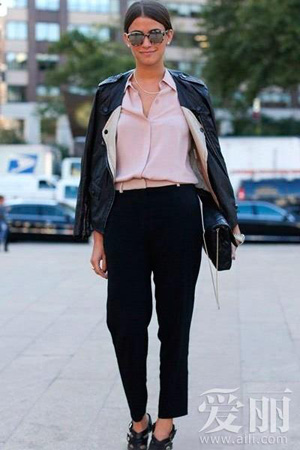 2. 普通的衬衫与披着的皮夹克混搭,同样轻松搭出模特范儿。