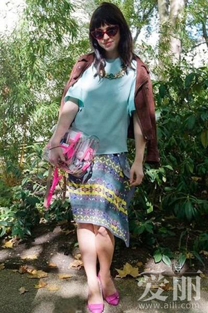 4. 蓝色T恤、不对称印花短裙,披上酒红色麂皮外套,轻松凹造型。