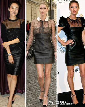 皮裙和透视上衣的搭配,一刚一柔,在视觉上有良好的冲突感,更加凸显出女性姣好的身材,十分好看!