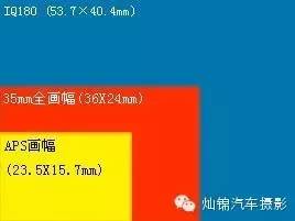 蓝色代表的便是飞思IQ180后背所采用的53.7×40.4mmCCD尺寸,红色是35mm全画幅的尺寸,黄色则是APS画幅的尺寸。645画幅的感光面是35mm全画幅的2.5倍,是APS画幅的6倍。