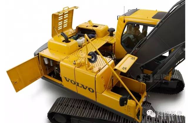 沃尔沃液压挖掘机,官方广告宣传图片,表现沃尔沃EC200B检查保养位置均开有宽阔结实的舱盖和自动锁定装置。